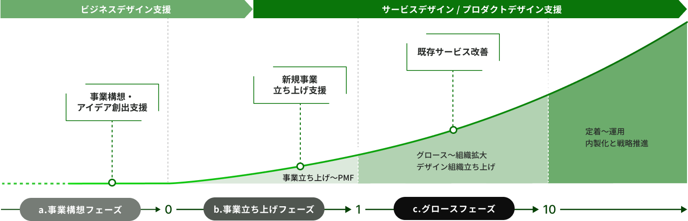 クライアント組織内のデザインチームや新規事業チームと共創し、事業の立ち上げから成長フェーズにおけるデザイン実行支援・ノウハウ支援、そして事業成長に応じた体制構築までを一貫して担うことが特色です。創業前の構想段階から、立ち上げ、グロース、組織化まで、幅広い事業ステージに応じたデザイン支援を行い、新規事業の成功確率の最大化と、持続的に事業を育てるための組織基盤づくりを支援しています。